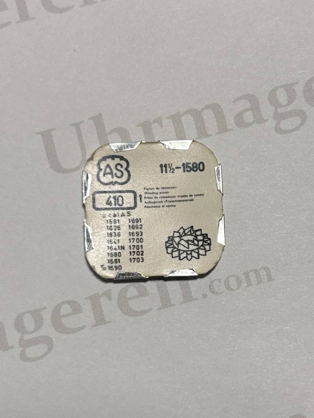AS Cal 1580-410. Winding pinion. NOS Also fits Cal 1581,1626,1636,1641,1641n,1680,1681,1690,1691,1692,1693,1700,1701,,1702,1703 the original packaging is not always simular but the product is