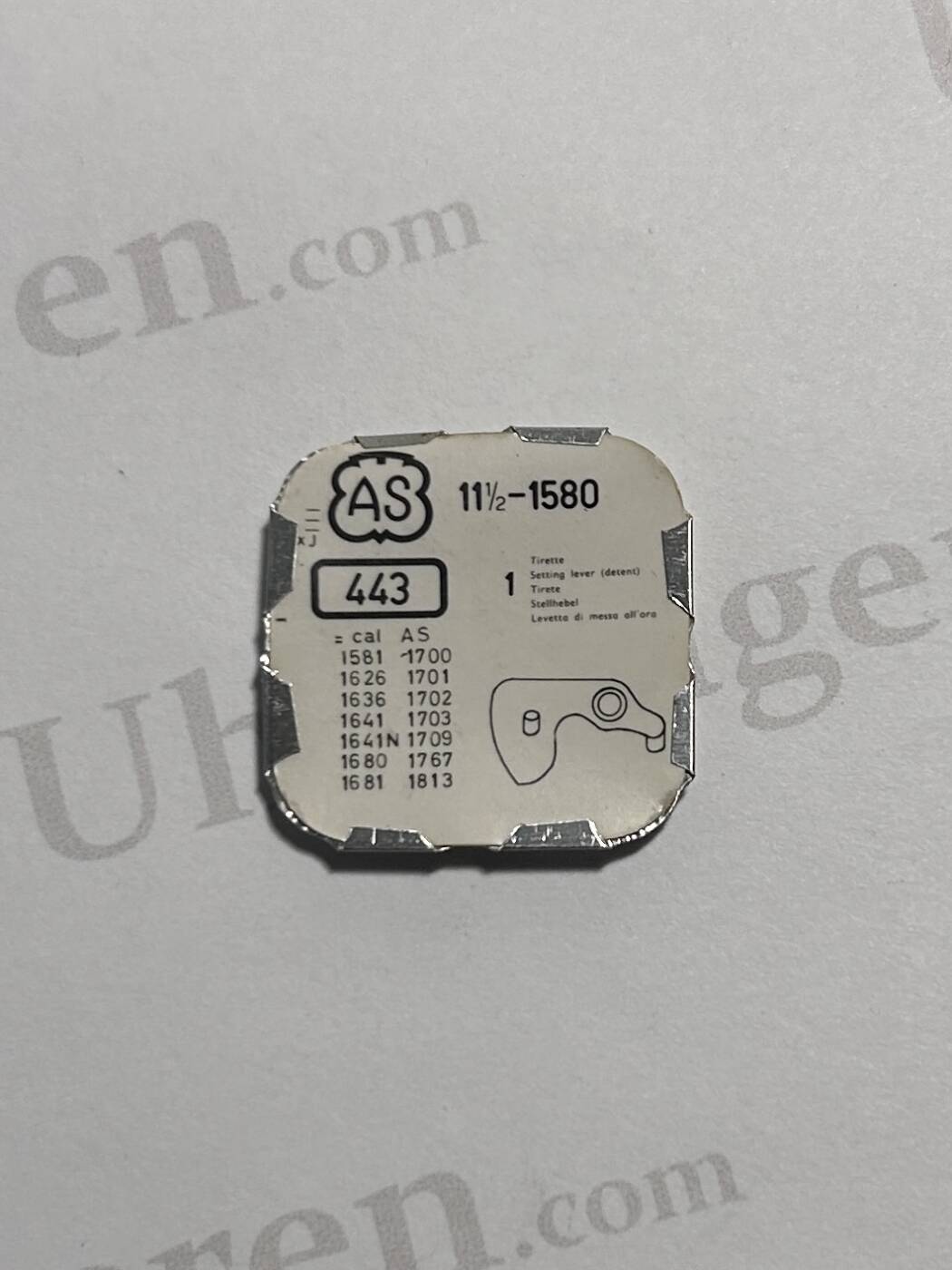 AS Cal 1580-443. Setting lever. NOS Also fits cal 1581,1626,1636,1641,1641n,16680,1681,1700,1701,1702,1703,1709,1767,1813 the original packaging is not always simular but the product is