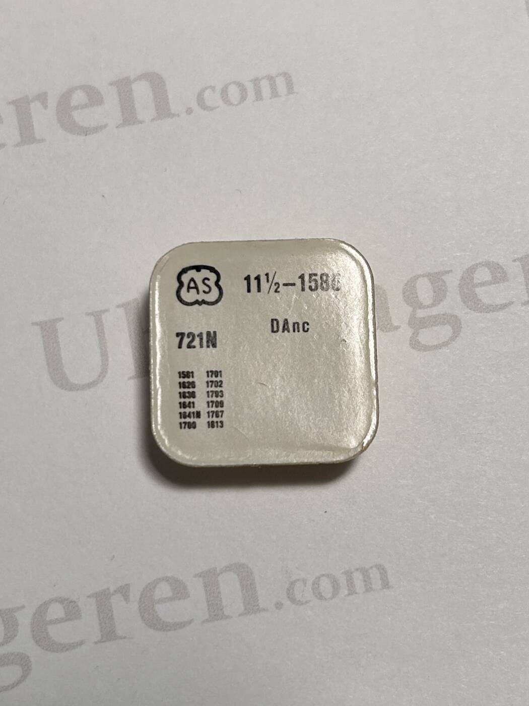 AS Cal 1580-721N. Balance wheel complete. NOS Also fits cal 1581,1626,1636,1641,1641n,1700,1701,1702,1703,1709,1767,1813 the original packaging is not always simular but the product is