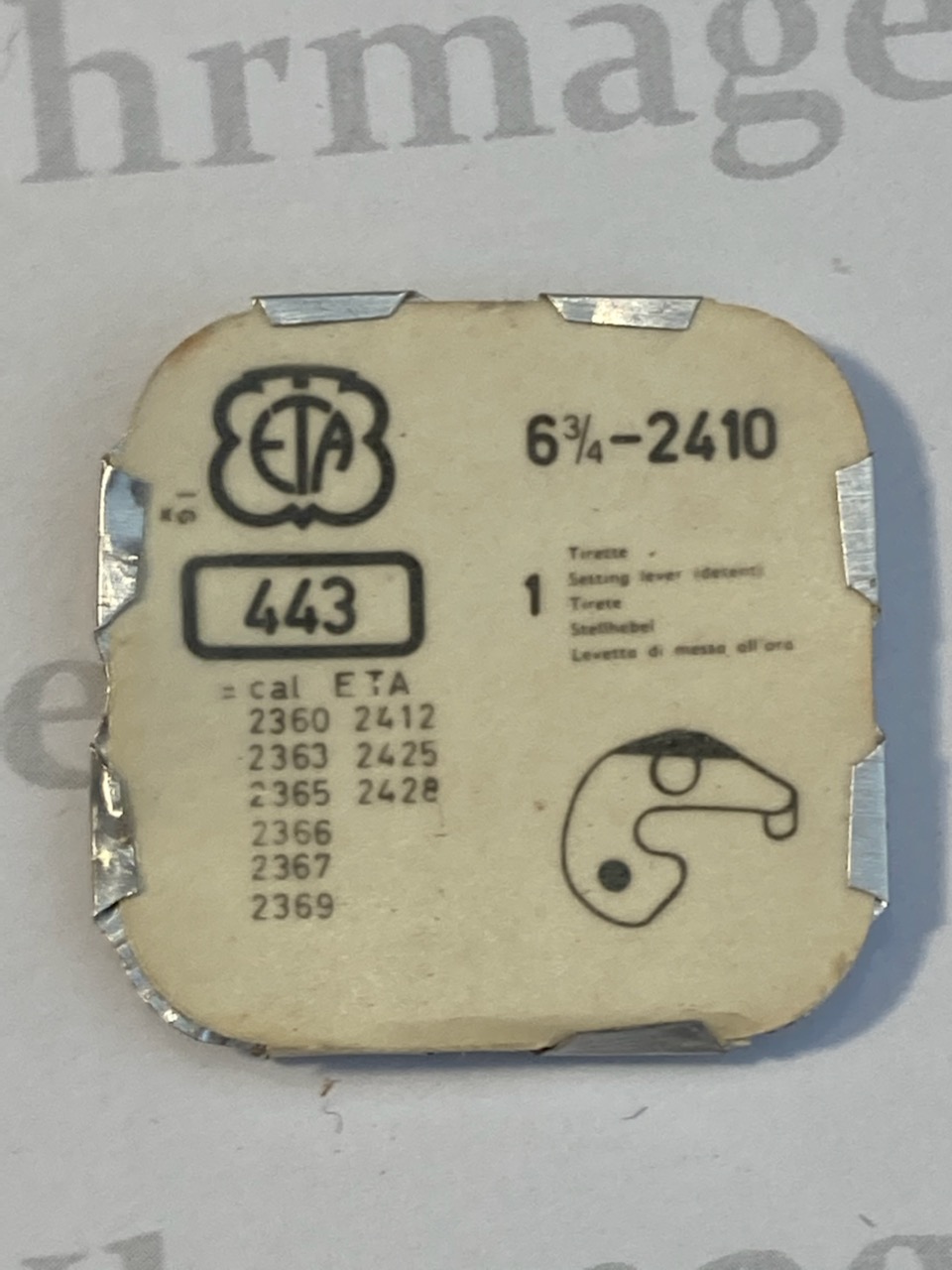 ETA Cal. 2410 part 443. Setting Lever. NOS. Fits for cal: 2412, 2425 & 2428, 2360, 2363, 2365, 2366, 2367, 2369